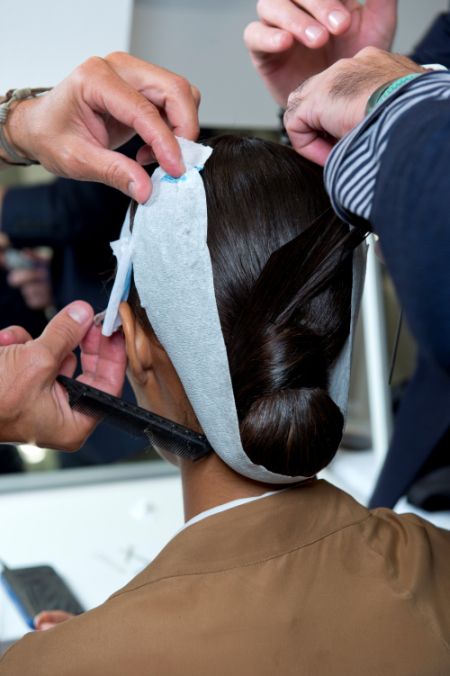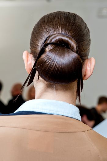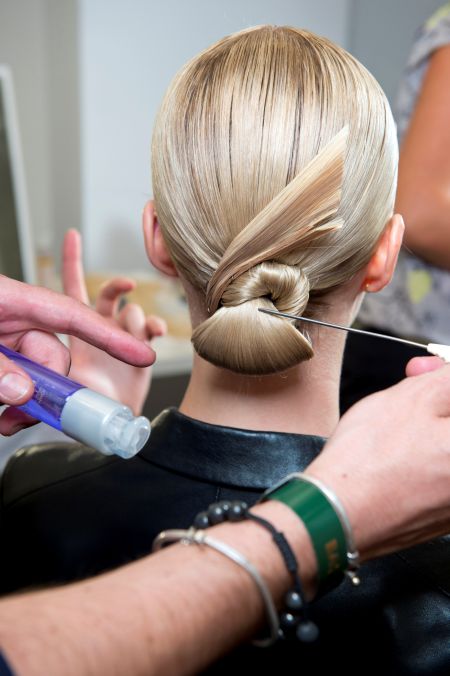 2. Во время показа Луиджи использовал накладные пряди, закрепленные вокруг пучка, чтобы создать элемент «языка пламени». Но в домашних условиях вы можете оставить концы волос пучка свободными, дополнительно зафиксировав их John Frieda Frizz-Ease лаком для волос сильной фиксации с защитой от влаги и атмосферных явлений и выпрямить с помощью утюжка.