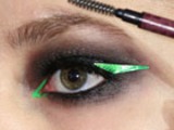 Визажист Пэт МакГрат придумал особенный декор дымчатых глаз. Он украсил их графичными неоновыми «стрелками» и таким же зеленым хайлайтером во внутренних уголках глаз.