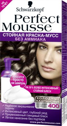 Летом 2013 года в семействе красок Perfect Mousse появились новые холодные каштановые оттенки. В коллекцию этого сезона вошли «Холодный эспрессо», «Морозный мокко» и «Ледяной капучино». Еще одна отличная новость: теперь краска-мусс приобрела экстрастойкий блеск. Глянцевое сияние стало на 30% интенсивнее!