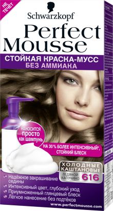 • Perfect Mousse – это бережное окрашивание! Единственная краска-мусс без аммиака на российском рынке. Именно отсутствие аммиака позволяет сделать процесс окрашивания более щадящим. А специальная формула обеспечивает дополнительный комфорт для кожи головы. Более того, Perfect Mousse не имеет запаха!
