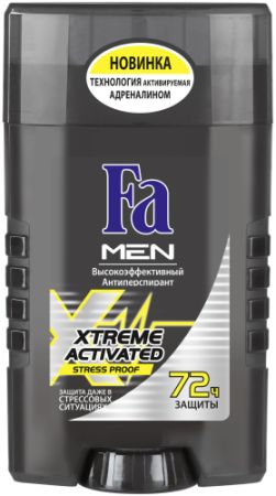 59% мужчин часто испытывают стресс на работе или постоянно находятся в состоянии цейтнота. Выброс адреналина в организме мужчины, вызванный этими факторами, приводит к более сильному потоотделению, чем когда представитель сильного пола спокоен и уверен в себе. Fa MEN Xtreme Activated Stress Proof – первый дезодорант от Fa MEN, реагирующий на стресс. Его высокоэффективная формула обеспечивает защиту от пота на 72 часа и нейтрализует неприятный запах, когда это особенно необходимо.