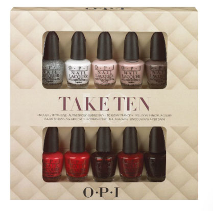 Основной набор – это OPI Take Ten, десять трендовых оттенков в мини-флаконах. Здесь собраны великолепные оттенки красного, nude и глиттер: