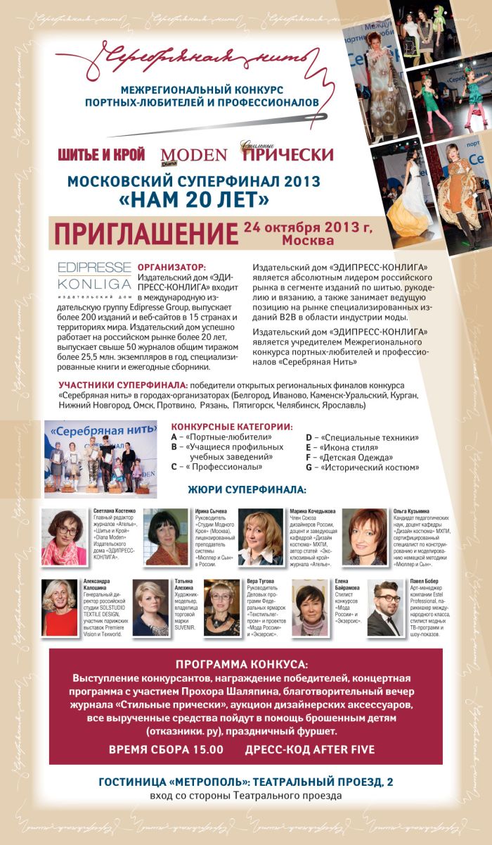 В Суперфинале примут участие более 50 победителей многочисленных региональных отборочных туров, проходивших в различных городах России.Общее настроение представленных ансамблей логично для наступающего осеннее-зимнего сезона. Элегантность линий, лаконичность фасонов, а также цветовые комбинации подчеркивают некую строгую сдержанность, характерную для наступающего времени года. Вместе с тем, на конкурс будут представлены вязаные комплекты, создающие впечатление уютности и комфорта, популярные для стиля кэжуал.