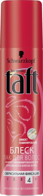 Лак для волос Taft Блеск Эффект Ламинирования позволяет добиться различных степеней фиксации прически, придав волосам на 50% больше зеркального блеска. Этот лак – настоящая находка для тех, кто ищет средство моментального преображения не только своих волос, но и всего образа.
