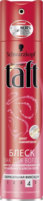 Осенью 2013 года Taft представляет обновленную и дополненную линию Taft Блеск, которая позволяет добиться эффекта ламинирования без специальных процедур в салоне красоты. Читать полностью |