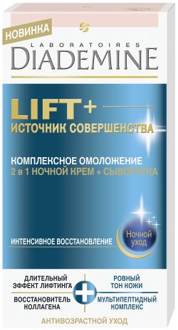 Крем для лица Diademine Lift+ «Источник совершенства» Ночной уход объединяет в себе преимущества ночного крема и мощное действие антивозрастной сыворотки, входящей в его состав. Интенсивно питает и заметно обновляет кожу в течение ночи, сокращая количество морщин для молодой и более совершенной кожи утром.