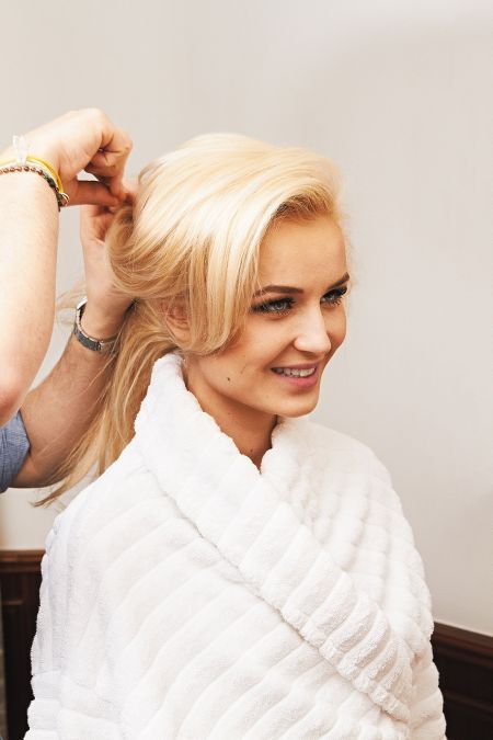 Чтобы создать законченный образ, необходимо пригладить волосы, собрать их в хвост на затылке и скрутить, закалывая последовательно шпильками от шеи наверх. Прическу можно закрепить, повторно сбрызнув лаком.