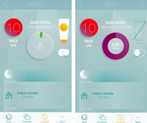 На браслете – куча датчиков, которые оценивают окружающую среду и докладывают на телефон (через Bluetooth), не грозят ли вам в данный момент солнечные лучи. Предварительно следует ввести параметры своего типа кожи, цвет глаз и волос в приложение на телефоне.