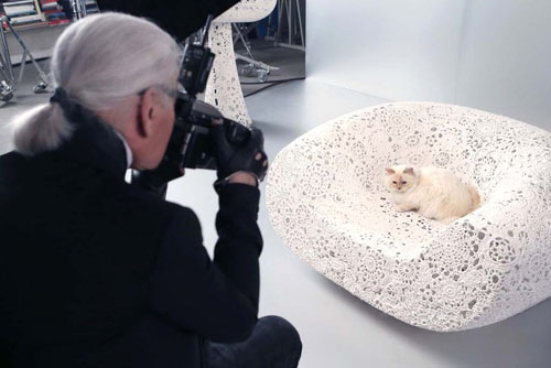 Кота зовут Choupette. Его хозяин не посмел оставить своего любимца одного перед камерой и светом софитов, а провел фотосессию самостоятельно.