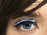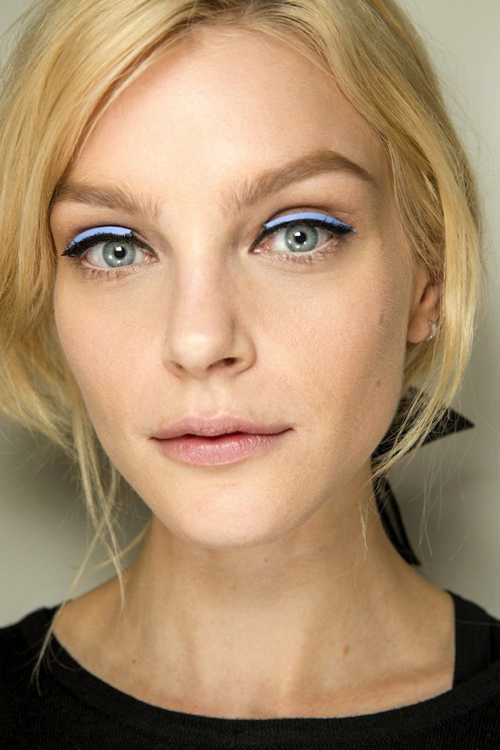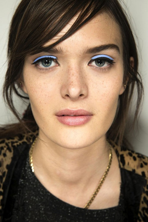 Это подводка для глаз, которая сделана из… настоящей кожи. Цвет – небесно-голубой. Ресницы покрашены тушью с пластиковым глянцем, что добавляет искусственный акцент новому приему в макияже.