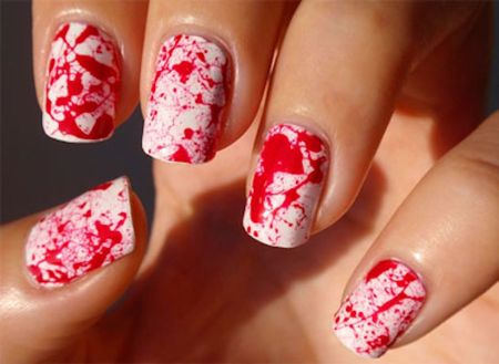 Кровавый маникюр – один из самых распространенных на хэллоуинских вечеринках. Эффекта кровавых брызг на ногтях можно достичь методом “выдувания” красного лака через трубочку на предварительно покрытые лаком любого оттенка белого ногти, и отдельного прорисовывания капель крови кисточкой. Несмотря на впечатляющий дизайн такого маникюра, по исполнению он один из самых легких.