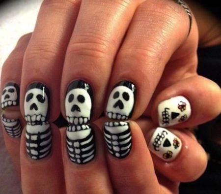 Маникюр с черепками или скелетами – более легок в исполнении в плане цветовой гаммы, здесь потребуются только белые и черные лаки, но сложен в тонкости прорисовки картинки. Ногти покрываются полностью белым лаком и делается черная “лунка”, после чего прорисовываются глаза и челюсть черепа или кости скелета. Не забудьте только нанести защитное покрытие, чтобы сохранить столь кропотливую работу как можно дольше в идеальном виде.