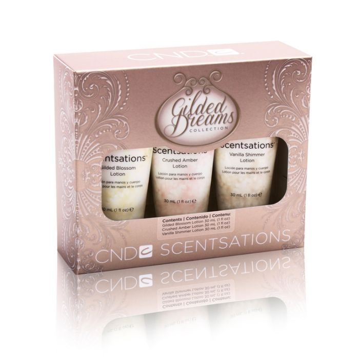 В преддверии Нового года корпорация CND представляет восхитительный набор из 3-х мини-лосьонов Scentsations Gilded Dreams. Это роскошное трио включило тёплые ароматы: Crushed Amber с цитрусовыми нотками, жасмином и ванилью; композиция из зеленого яблока, бергамота и мускуса Gilded Blossom, и сверкающий лосьон с чувственным ароматом ванили Vanilla Shimmer.