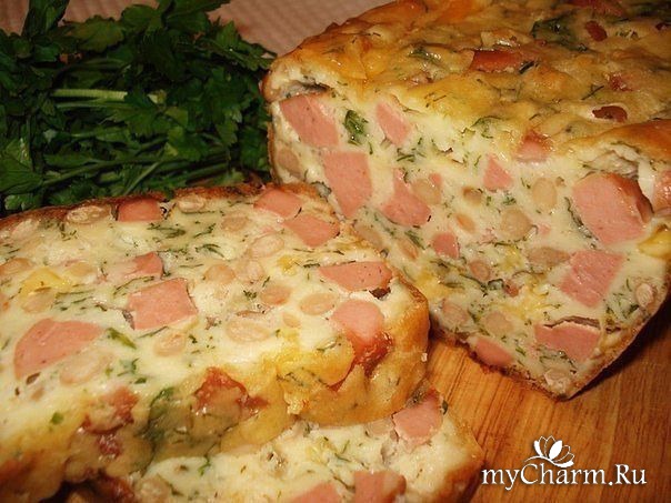 2. Сардельки и сыр нарезать кубиками, зелень мелко нарезать. Добавить в тесто перечисленные продукты и фасоль. Перемешать.