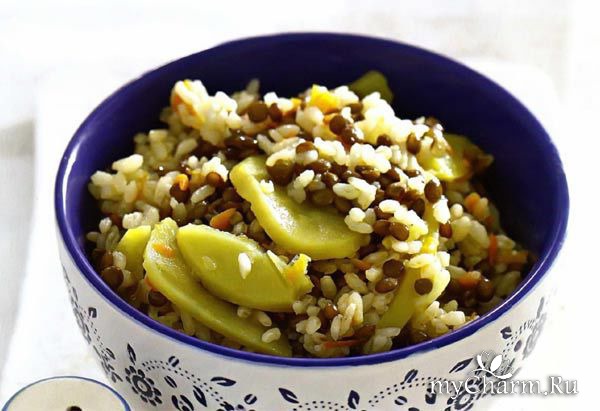 8. Залить выложенные в кастрюлю или казан овощи с рисом горячей водой. Жидкость должна полностью покрывать продукты, промежуток между чечевицей и верхней линией воды должен быть равен толщине двух пальцев.