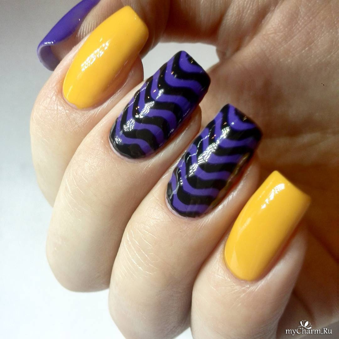 Участники маникюра: указательный и мизинчик #dancelegend 304 цвет сияния; безымянный и средний - фиолетовый #vipera 836 серия High Life, черный maxi color gel effect 3D тон 07. Топ #butterfly Top-Coat VIN-YL. Дизайн выполнен с помощью волшебного трафарета #vinylist Волна V 013.