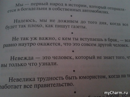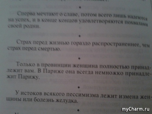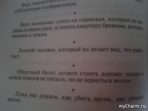 Здравствуйте, дорогие Майчармельки. Давненько не флудили. Пофлудим? или нет, погадаем? или нет, развлечёмся? Многие из нас наверное слышал, прот такой метод гадания- открыть книгу на любой странице и прочитать первое попавшееся предложение. Это гадание скорее носит развлекательный характер. Вот я и решила с вами поделится замечательной книгой, сборником афоризмов. ВОТ ОНА... Читать полностью |