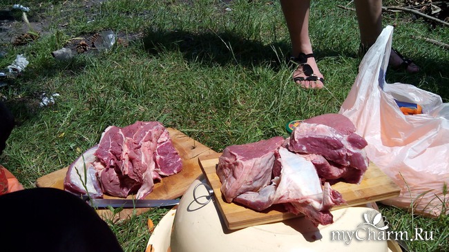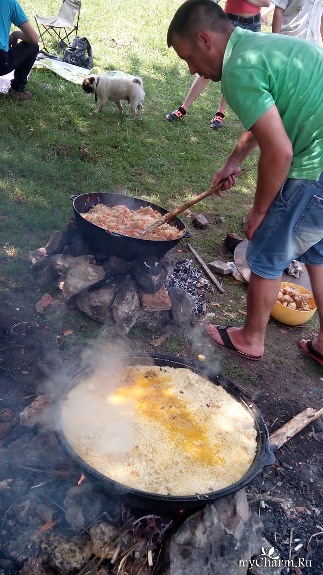 Мужчины приготовили нам плов: один казан - узбекский с говядиной, другой со свининой.
