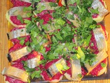 Простая в приготовлении закуска, я ее называю ленивая "шуба" Отвариваем картофель, нарезаем круглыми ломтиками. Свеклу натираем на мелкой терке и смешиваем с майонезом (ложить нужно немного, чтобы не жидко было). На ломтики картофеля кладем по ложечке свеклы, сверху украшаем кусочком сельди, и все - закуска готова. Украшаем по желанию. Читать полностью |