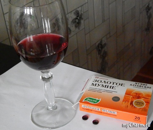 Для этого надо мумие и красное вино (у меня домашнее натуральное), порошок мумие растворяется в вине. Хранится такая смесь в темном стеклянном флаконе в холодильнике.
