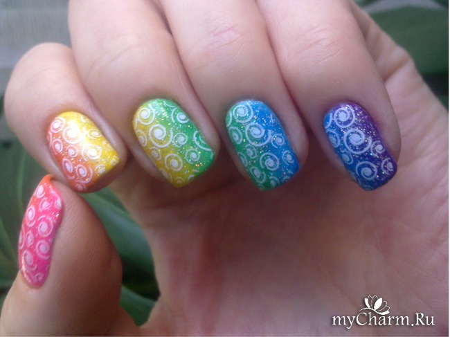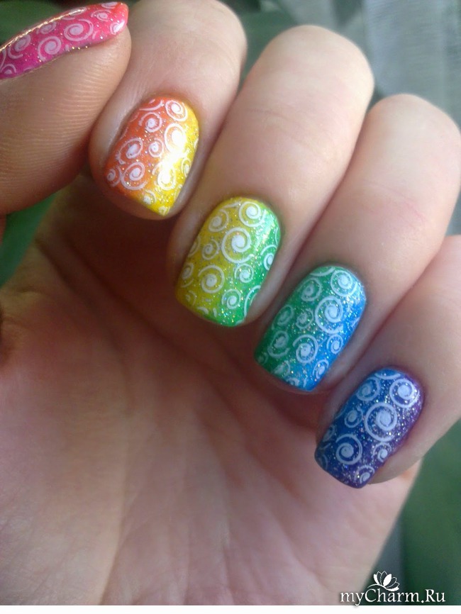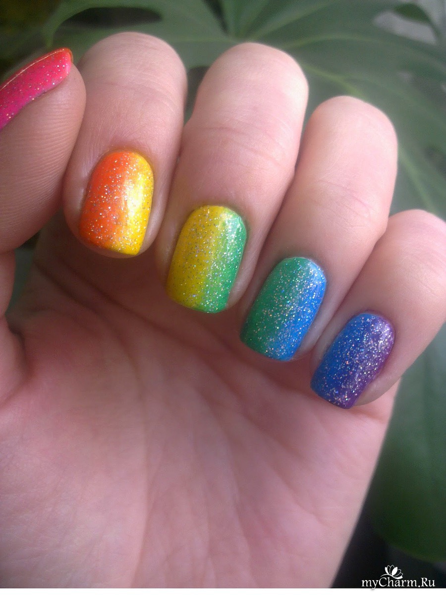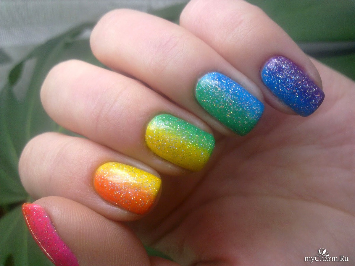 А теперь о самом маникюре. Сначала я покрыла ногти белой эмалью и дождалась полного её высыхания. Это нужно делать чтобы градиент получился красивого яркого цвета. Затем с помощью обычной посудной мочалочки я сделала градиентный радужный маникюр. Попеременно наносила на губку нужные цвета лаков и промакивающими движениями отпечатывала на ногте так, чтобы переход цвета образовался вдоль роста ногтя. Для насыщенности я проделала эту операцию дважды. Убрала огрехи с кутикулы и покрыла всё голографическим топом.