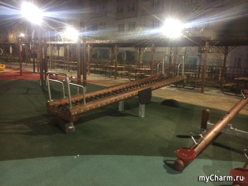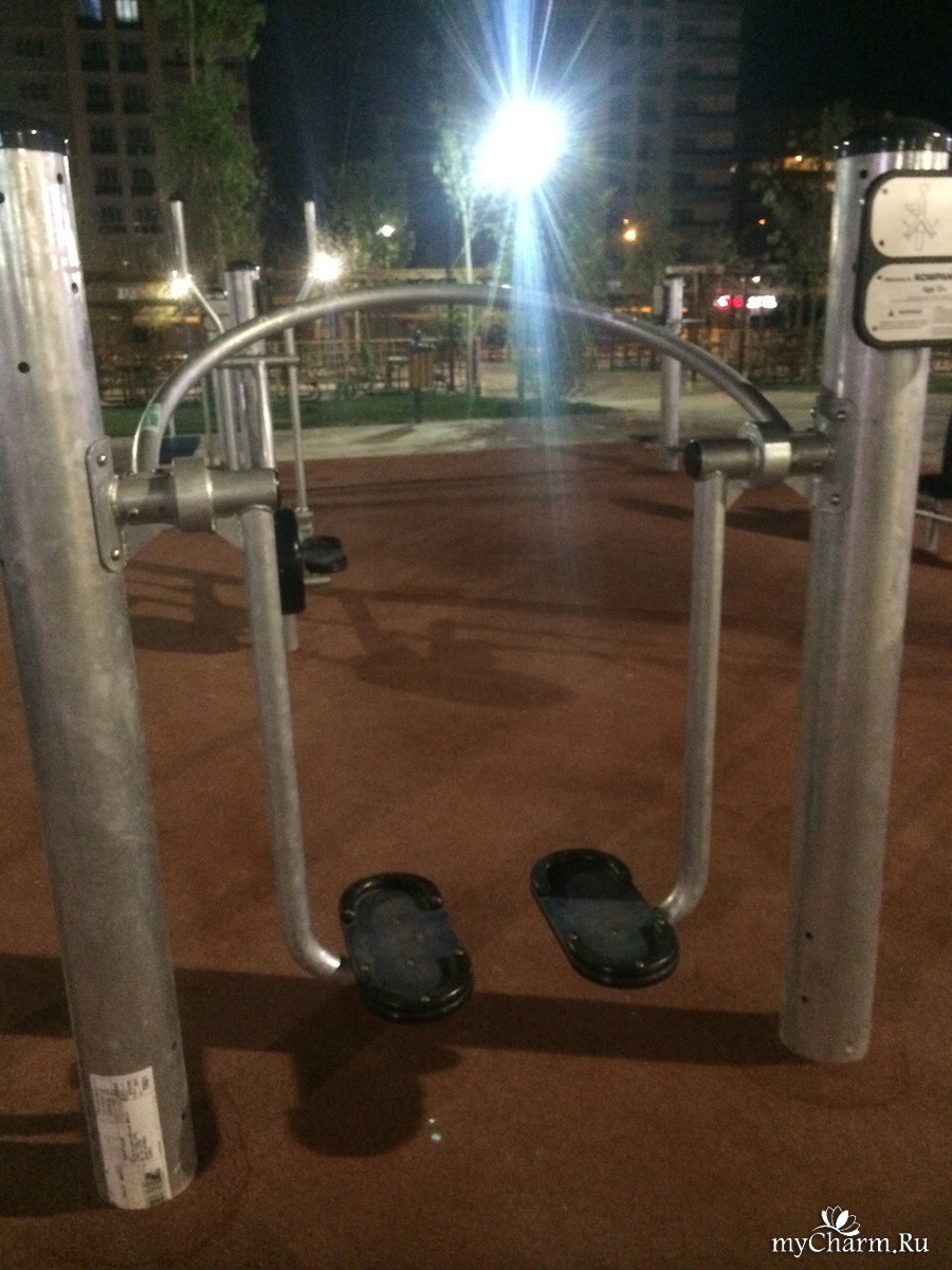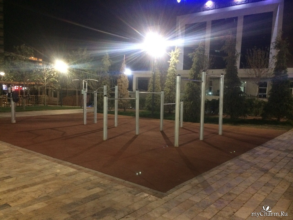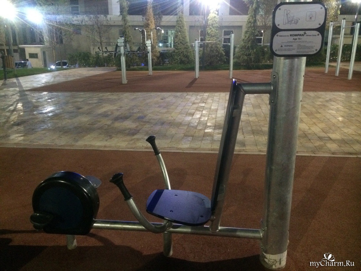 А теперь перейдём к спортивной площадке. Спортивная площадка раздлена на две части. Одна часть с турниками, скорее всего для мужчин или людей, имеющих специальную спортивную подготоку.