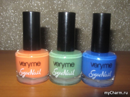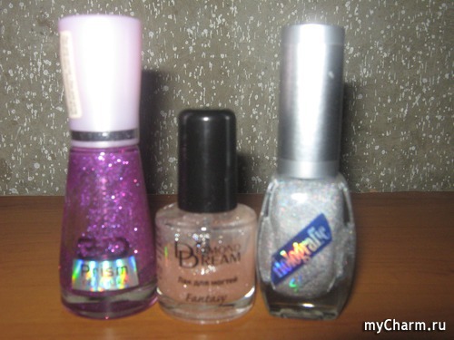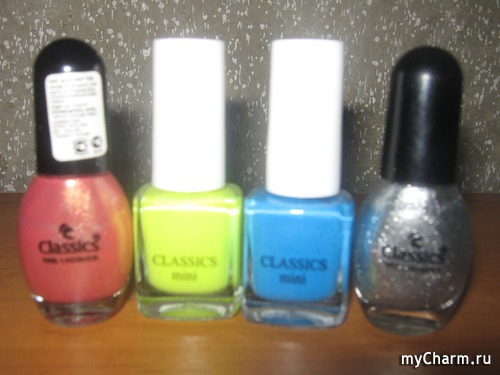 А эти лаки просто замечательные (за исключением желтого (красит ужасно, как только не старайся)), даже по не сколько лет хранятся... На фото видно, что фиолетовый уже осекся, но он также хорошо красит, если его перемешать!