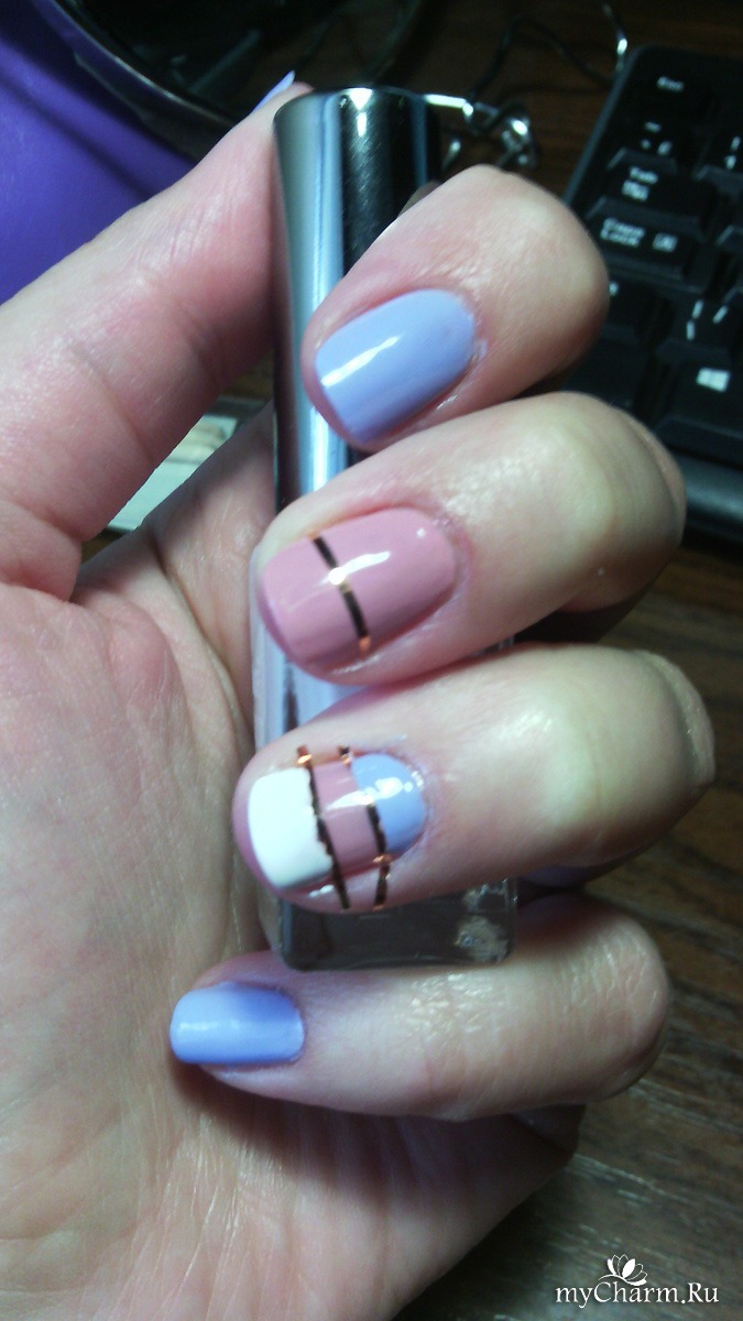 Доброго времени суток всем, кто заглянул сюда! Покажу вам свой новый маникюр))) Для начала красим ногти основой, чтобы защитить ногтевую пластину. После покрываем двумя цветами Когда лак подсох, клеем ленты и порываем один ноготь еще двумя цветами, а на втором оставляем ленты для декора Ленты сразу нужно отклеить, пока лак не высох, иначе будет тянуться лак за лентами... Читать полностью |