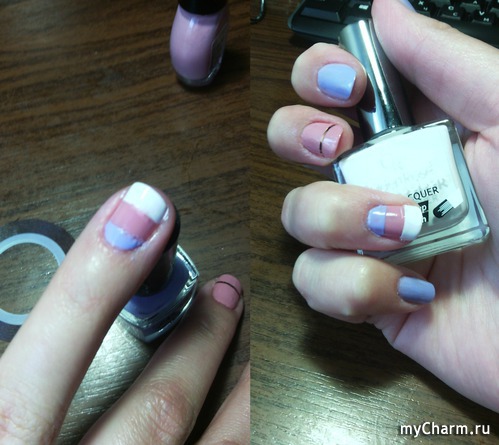 Далее ждем пока лак высохнет и клеем ленты на границы цветов лаков, тем самым закрывая неровности. Подтираем лак с кожи и покрываем прозрачным закрепителем и маникюр готов!