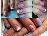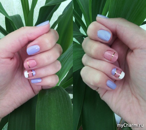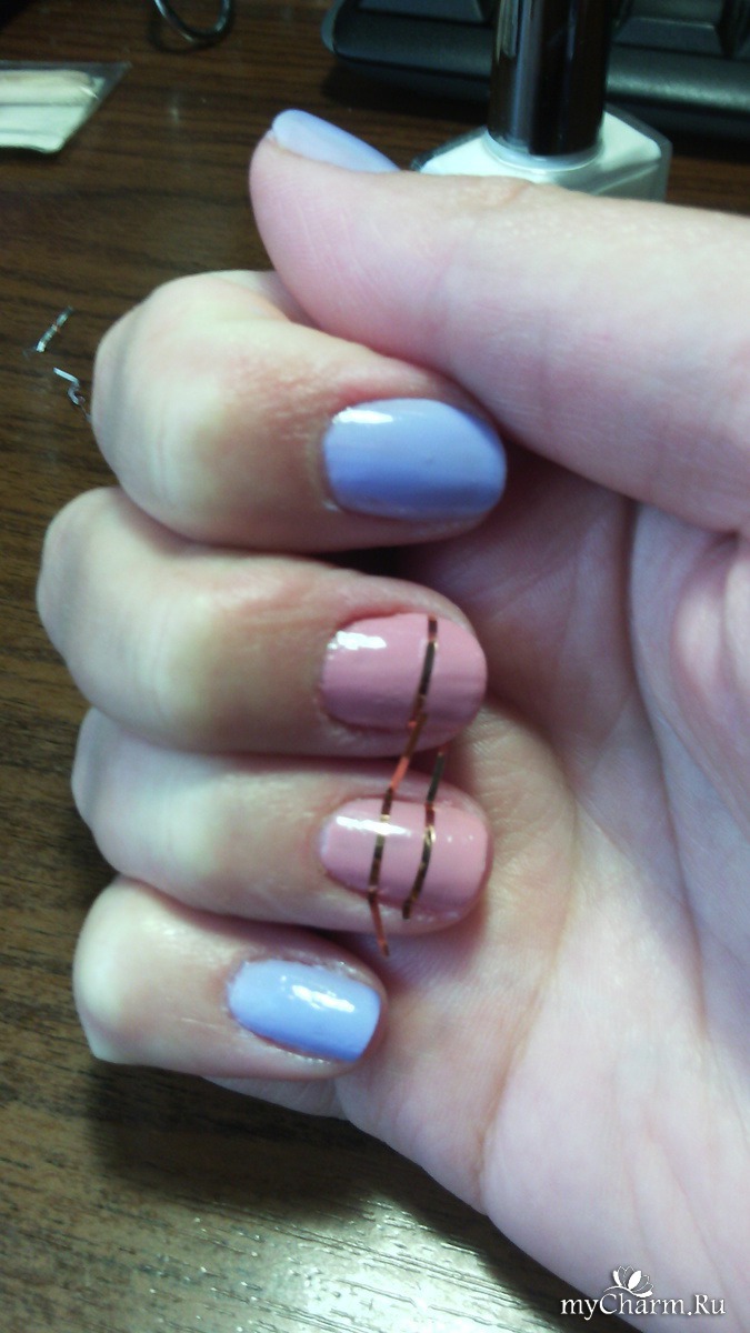 и порываем один ноготь еще двумя цветами, а на втором оставляем ленты для декора