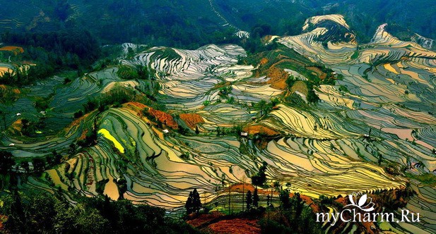 Считается, что рис в Китае начали выращивать почти 8000 лет назад. С тех пор масштабы рисовых полей разрослись и поражают взоры своей красотой. Чтобы насладиться красочным зрелищем, лучше отправиться в провинцию Юньнань. Именно там находятся одни из самых больших и красивейших в мире рисовых террас. Лучшее время для их посещения — осень, так как к этому времени года рис созревает и склоны гор окрашиваются в золотые и багряные цвета. Рисовые террасы в Юньнани создавались вручную крестьянами, которые проявили свою смекалку, чтобы приспособить холмистую местность к сельскохозяйственным нуждам. Расположены террасы на высоте от 200 до 2000 м над уровнем моря и занимают более 20 000 квадратных км. Добраться туда не так просто, но зрелище того стоит!