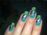 Нарисовала серебристую извилистую линию посредине ногтя. Ту часть "зелёнки", что возле лунки, я покрыла прозрачным шиммерным лаком, чтобы добавить свечения и сбить немного эту зелёность, неподошедшую мне. А "зелёнку" на краю ногтя закрасила другим зелёным лаком, травяного оттенка, такие мне больше подходили, как оказалось.