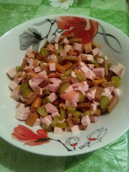 а у меня обычно сухарики, кукуруза и колбаса))это когда хочется салата по-быстрому)