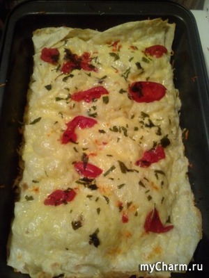 Далее повторяем процедуру пока не закончится лаваш. Последним слоем будет сыр и зелень. Я нарезала еще помидорку.
