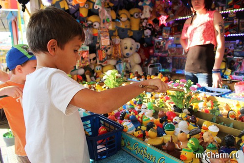 Во всех аттракционах, где детки бросают дротики, метают шары, ловят магнитиками игрушки – везде, не зависимо от результата, дети получают подарок, который они с огромным удовольствием сами выбирают в огромных корзинах) Внук порывшись в корзине, выбрал браслетик с белыми ракушками и подарил дочери со словами: "Мама, я для тебя выиграл, очень подходит к твоей белой кофточке" - так трогательно!