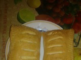 Тесто должно быть размороженным. Режем его на полоски см 10 в ширину. Я это действие пропустила, т. к. у меня тесто уже было порезано полосками. берём одну полоску и раскатываем немного в одну!!! сторону. Потом разрезаем полоску на квадраты. У меня получается четыре квадрата с полосы.
