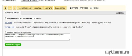 Здравствуйте! Не могу добавить видео со своего канала ютюб. Делаю все как надо, вставляю ссылку через html - код, вставляю видео в запись, но видео не загружается. В чем может быть проблема? Хотелось бы решить эту проблему и сделать свой дневник более интересным и интерактивным. Здесь даже попробовала вставить видео, так же без результата.