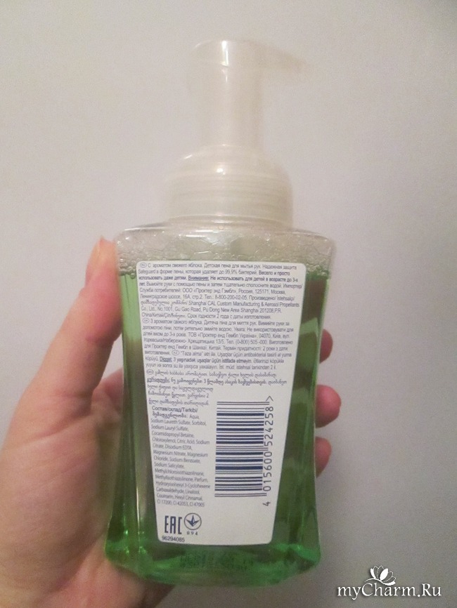 Когда я потрясла баночку с этим мылом, то увидела, что оно слишком жидкое. Во всяком случае гораздо более жидкое, чем классическое жидкое мыло Safeguard. Подумалось, что оно будет растекаться по рукам ребенка и по этой причине быстро закончится. Но при нажатии на конусик флакона меня и ребенка ждал сюрприз. Жидкость вытекла из него в виде …нежнейшей белой ароматной пенки. Ребенок был просто в восторге. С этой пенкой он и в ванной играл, и руки с удовольствием ею моет. Придумал целую игру в «бритье взрослого мужчины». Намазывает пенкой лицо в районе подбородка и тщательно «сбривает» ее детской лопаточкой)).
