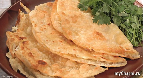 После незначительной расстойки тесто разрезать на куски весом 75 г, которые раскатать на тонкие лепешки и выпекать на раскаленной сухой сковороде до румяной корочки.