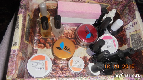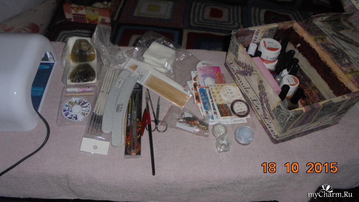 В итоге этим летом уже сын сказал мне:Ну и долго вы будете мучиться? И, когда я в очередной раз была в городе, увел меня в магазин-салон, специализирующийся на ногтях, ресницах и волосах. Так у меня появилось МОЕ БОХАТСТВО))))Вот, хвастаюсьИ началось)))))Сначала тренировалась на себе, вспоминая мои сеансы в салоне, потом лезла в тырнет, сверялась, потом сюда-впечатлялась вашими работами. Потом эксперементировать на себе надоело и я начала третировать дочь, чтобы отдала мне свои белы ручки, а потом под мои издевательства стали попадать и подружки