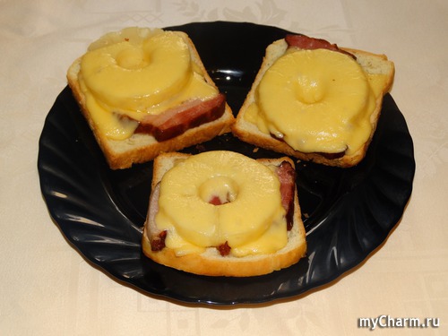 Майонез, в основном не ем, поэтому без него. На хлеб ложу хэм или ветчину, или другой вид мяса, на него консервированый ананас и сверху сыр. И отправляю в духовку