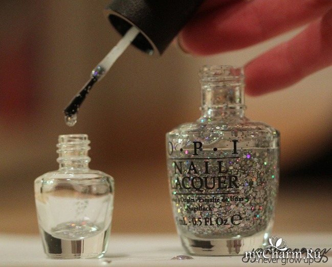 Голографический глиттерный лак, который нужно капнуть в пустые флаконы по несколько капель и встряхнуть флакон, чтобы лак растёкся по стенкам.