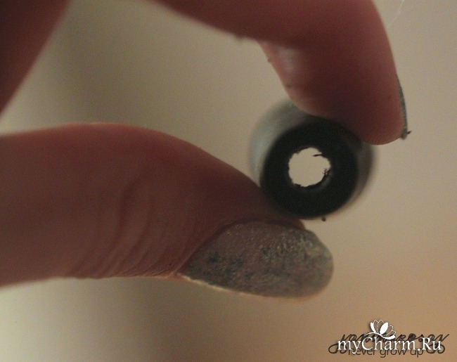 В крышечках флаконов проделываем отверстия, чтобы туда вошла лампочка гирлянды. Кисточку конечно же удаляем.