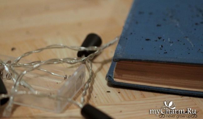 Затем берём обычную гирлянду с маленькими лампочками. Если лампочки покрыты какими-то фигурками, то снимаем их.