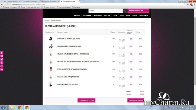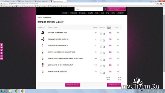 Пришлось до этого тушь зелёную убрать, а ещё средство для ногтей, и ещё что-то. Очень понравился сервер. Легко и удобно смотреть, быстро добавлять продукты в корзину, в верхнем правом углу видна сумма.
