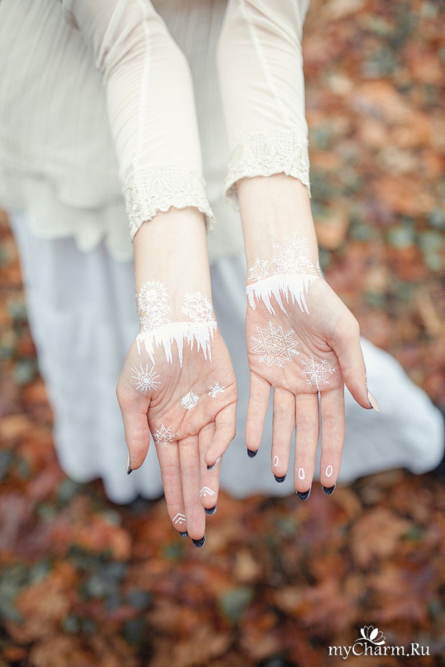 Но нашелся один бренд, который решил доказать, что временные тату могут быть актуальными и зимой. Это тату белого цвета. Они отлично смотрятся на бледной коже, имитируя снежинки и ледяные узоры.