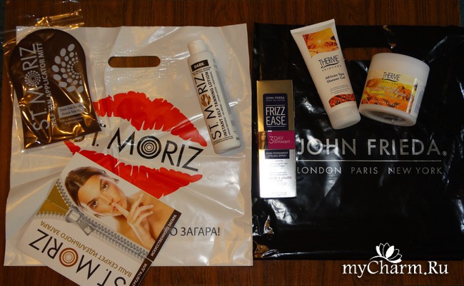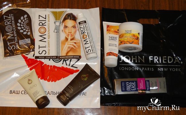 Все продукты просто чудесные с виду: крем для тела, гель для душа, средство для волос, автозагар, каталог, варежка и еще один красивый белый фирменный пакет!