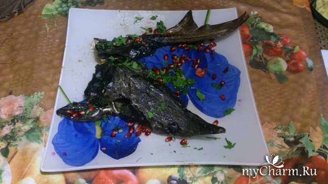 Мы с ней накрыли стол как раз к приезду гостей. Но сфотографировать его мне не удалось, Пока я сняла фартук, накрасила губы и причесалась, гости разрезали рыбу положили по тарелкам... остался хвостик и голова..