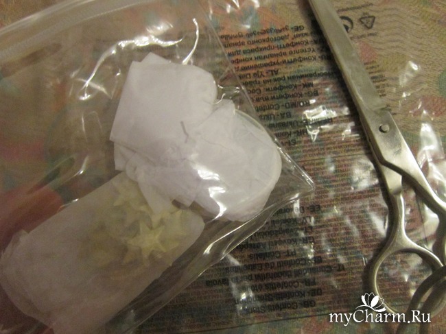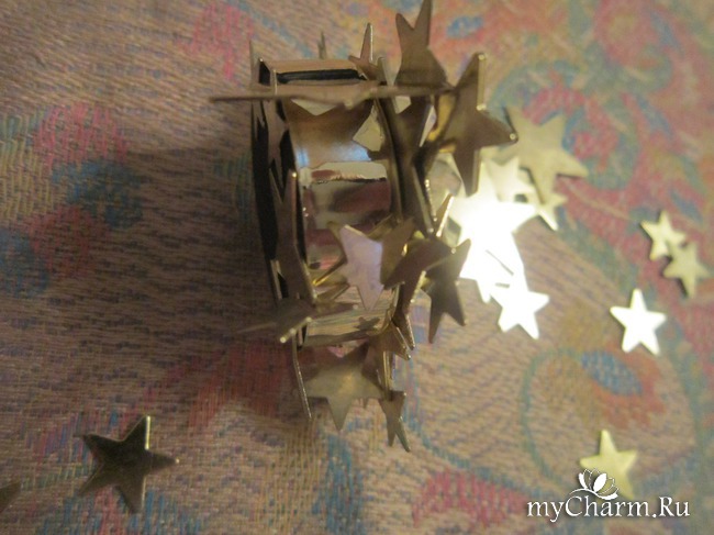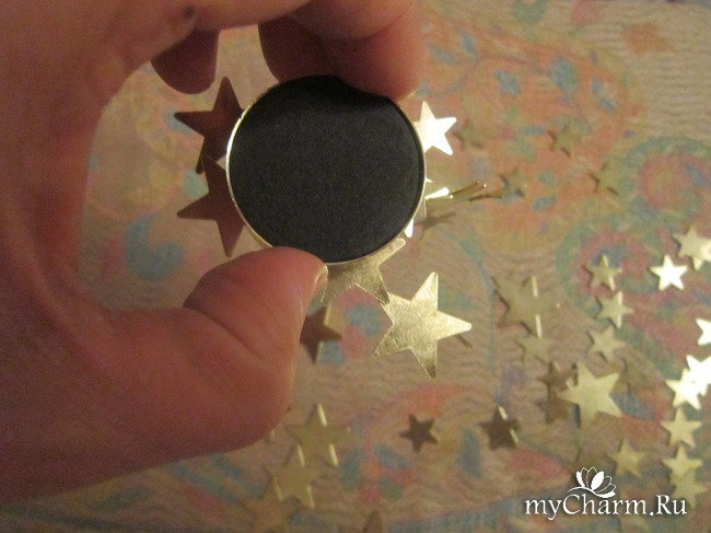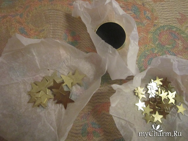 в упаковке находится большие металлические и маленькие металлические звездочки и магнит все золотистого цвета