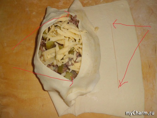 Сыр. По бокам делаем надрезы и складываем тесто внахлест.